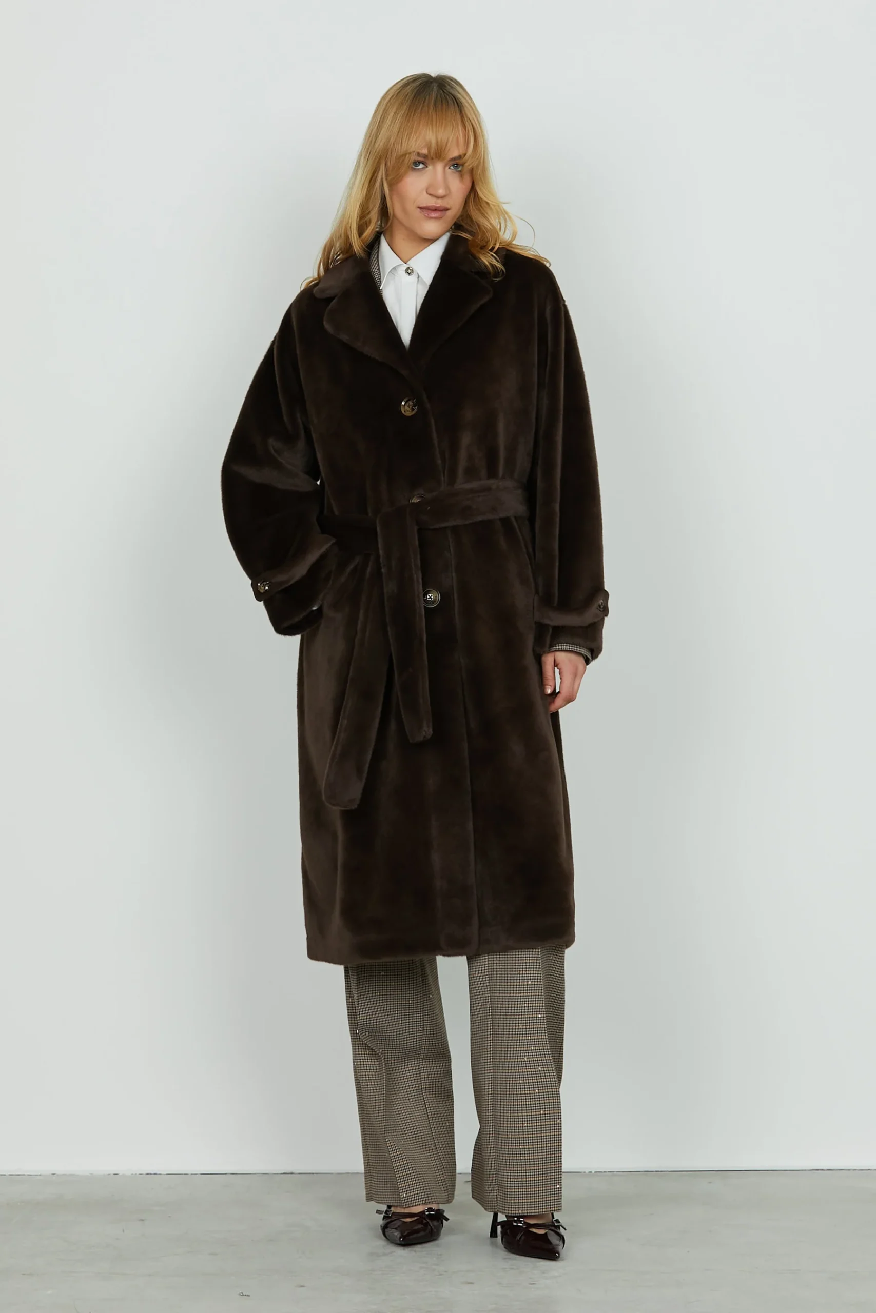 Abrigo de piel ecológica de manga larga CHAMLET con solapas, múltiples bolsillos y cinturón