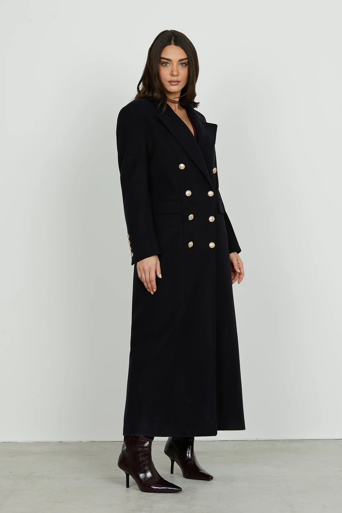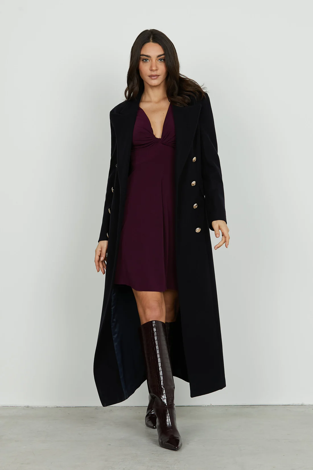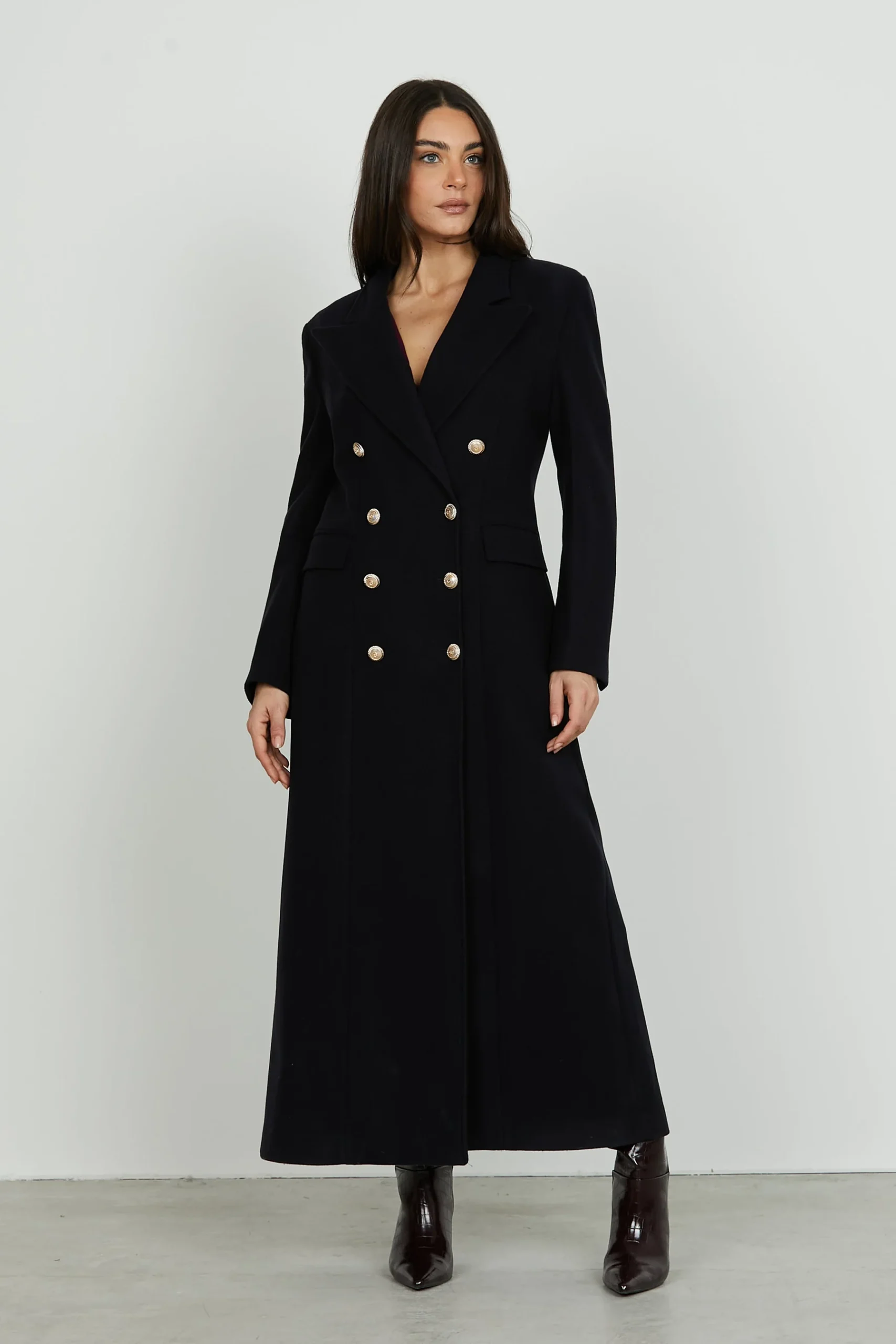 Abrigo largo TERES de manga larga, cruzado, con bolsillos, solapas y abertura en la espalda.